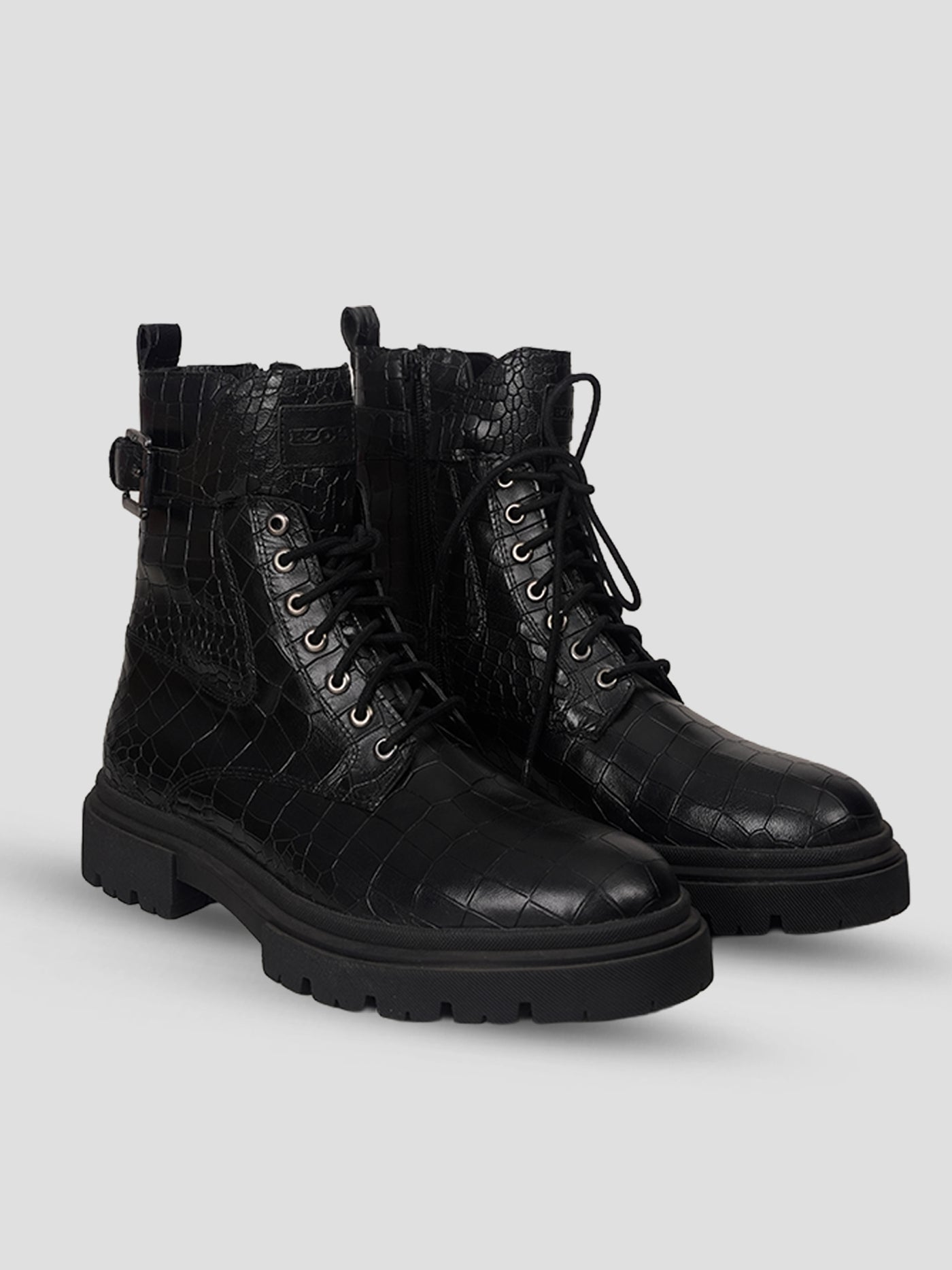 Step up your style with EZOK Men’s Black Leather Lace-Up Boots, designed to deliver a perfect blend of durability, comfort, and modern fashion. Made from premium-quality leather with a croc-textured finish, these ankle-length boots add a bold and refined touch to your outfit.