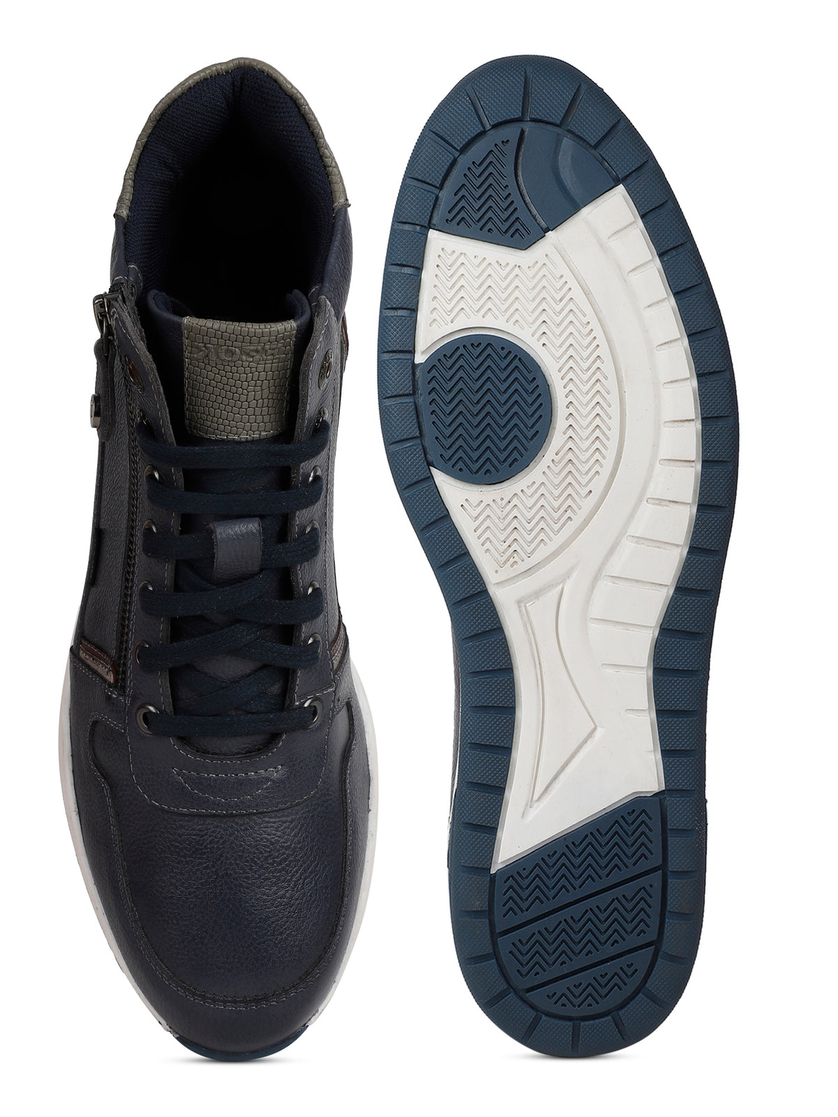A pair of round toe blue sneakers ,has regular styling,