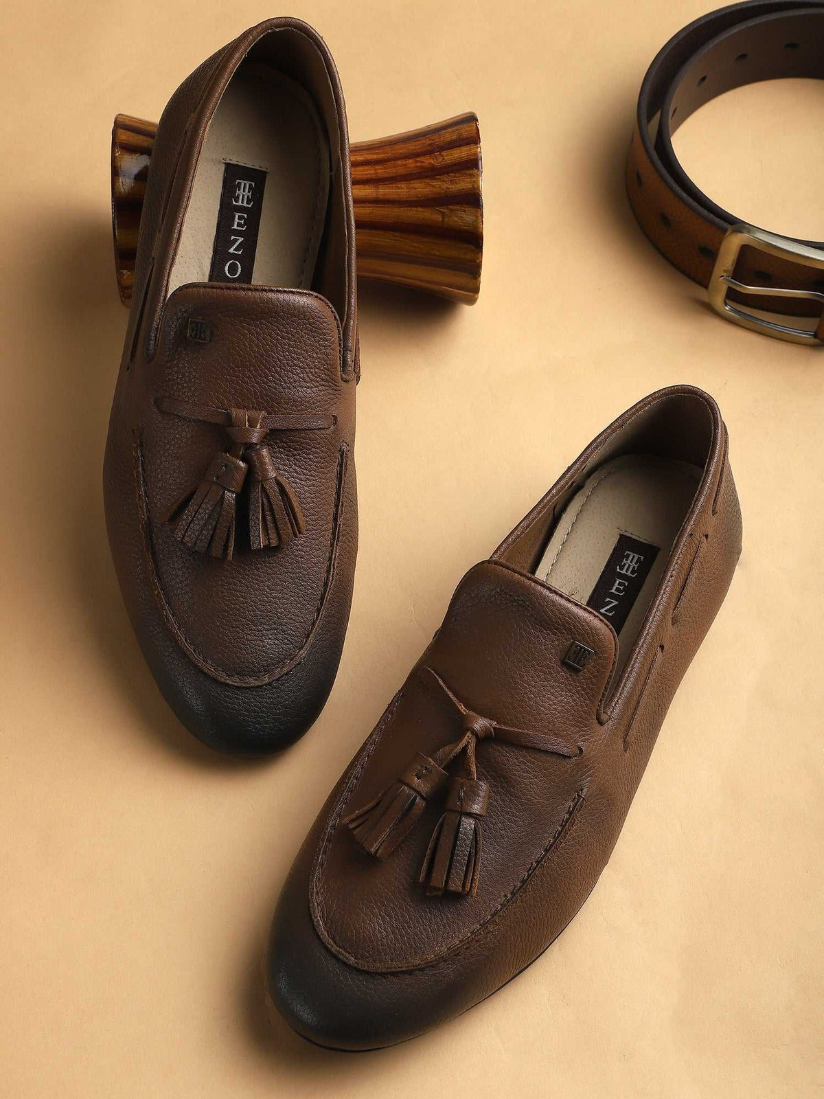 Ezok Men A Pair Of Solid Patrizio Loafer Flexi Slip-Ons Dark Tan Round Toe , Has Upper Genuine Leather Faux Leather Lining.