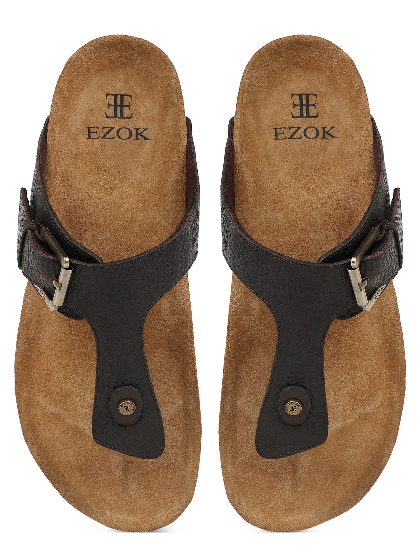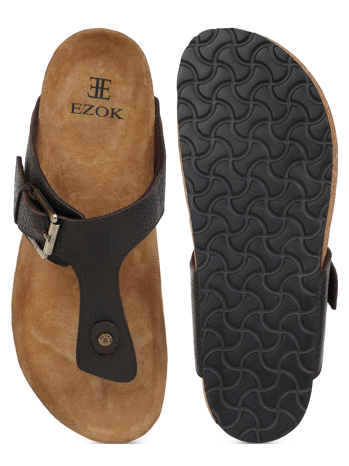 A pair of brown solid round toe sandals has mid-top styling Leather upper Cushioned footbed Eva outsole