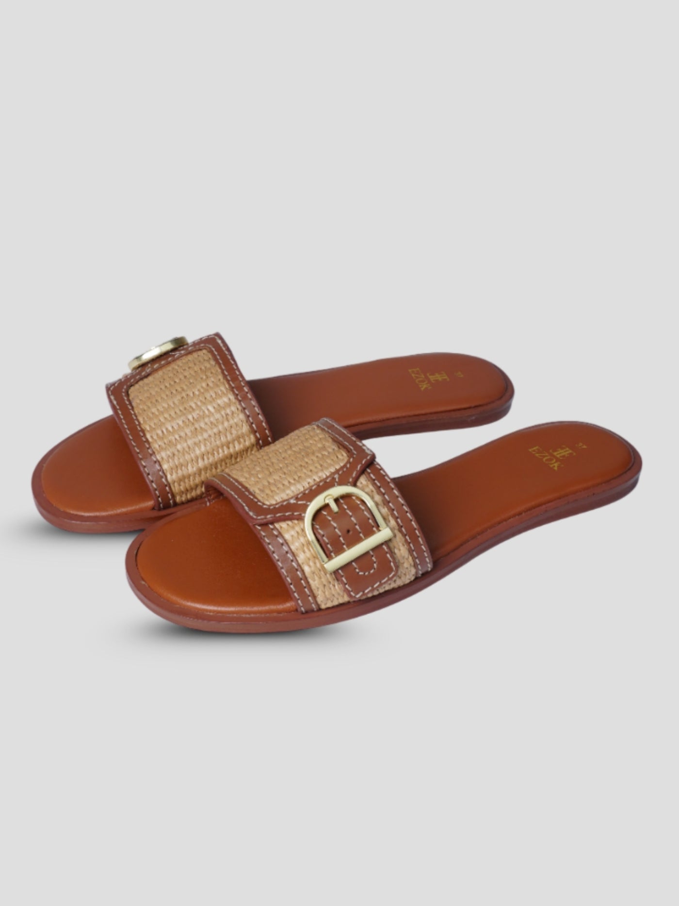 Step into effortless style with the Ezok Tan Leather & Raffia Slip-On Sandals. Designed with a premium leather upper combined with raffia detailing, these sandals offer a unique blend of elegance and contemporary charm. The buckle accent adds a stylish touch while ensuring a secure and adjustable fit.